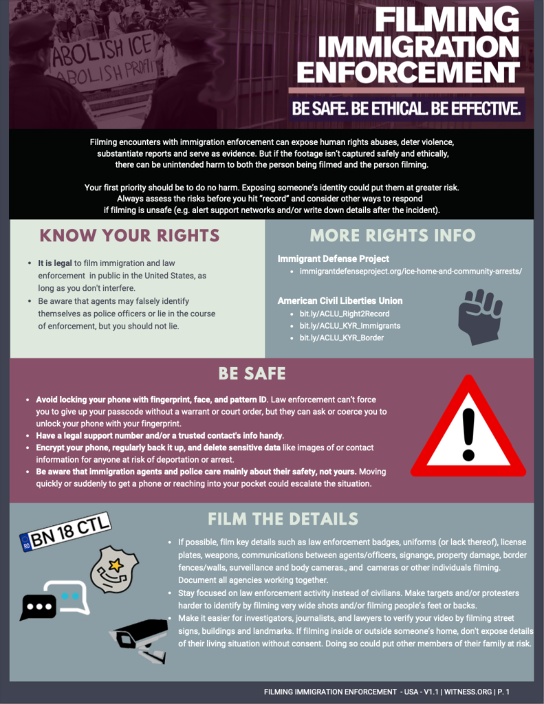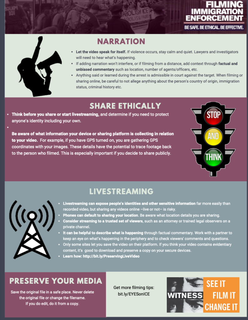 Though communities are organizing and finding important ways to resist, ICE raids and encounters are unpredictable and therefore challenging to prepare for. Filming these encounters can serve as a form of accountability, but if footage isn’t captured safely and ethically, there can be unintended harm to both the person being filmed and the person filming.